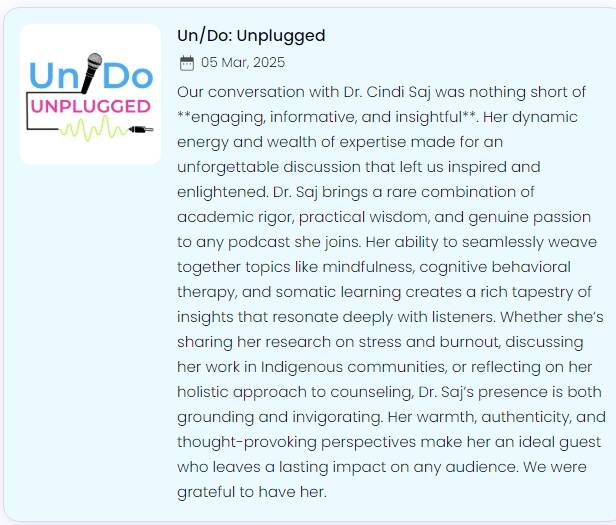 Welcome to the Media page of Cindi Saj, a best selling author, thought leader and expert therapist specializing in Cognitive Behavioral Therapy (CBT), Eye Movement Desensitization and Reprocessing (EMDR) Therapy, Hypnotherapy and Yoga for Trauma and Mental Health Recovery.